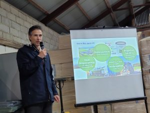 Frode Halvorsen, daglig leder i Air Liquide, orienterte om prosessen mellom de to initiativene om biogassatsning som startet opp for to år siden. Anlegget skal etableres på Grødaland i Hå. Det skal produsere 130 -140 GWh. av 650 000 m3 husdyrgjødsel. Dette redusere klimagassutslippene med 65 000 tonn CO2-ekvivalenter, som tilsvarer 15 % av CO2-utslippene i regionen. Det skal brukes avvanningsteknologi på gårdene/hubbene. Framdriften for anlegget ble det ikke sagt noe om.